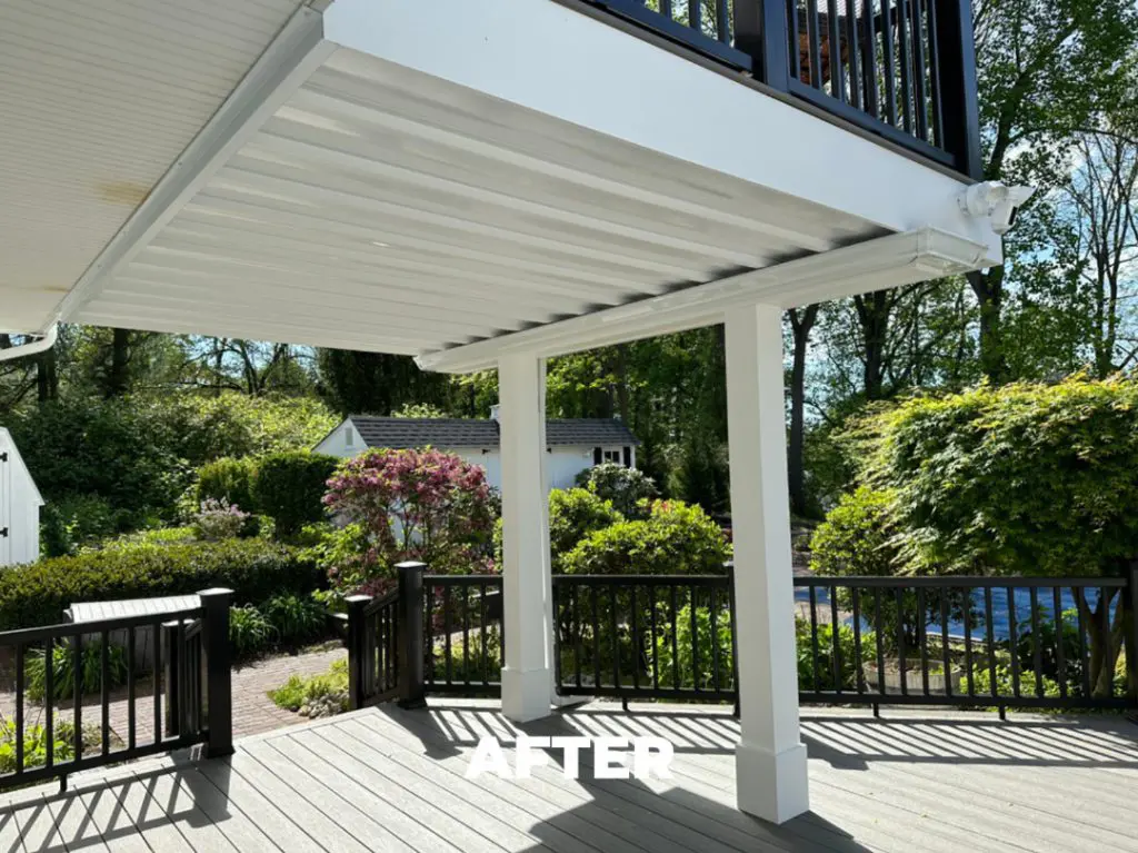 For this project we went out to Colts Neck, New Jersey, and transformed this home’s deck to a Driftwood color, complemented by Black railings and Driftwood railing tops. White was chosen for the risers, fascia, skirting, and columns, creating a clean and cohesive look. We also took care of the replacement of various components, including decking, railings, steps, risers, fascia, skirting, and columns for both the main and second-story decks. Additionally, existing wood built-ins like seats, planters, and cabinets were removed and replaced with new ones, and an Azek PVC wrap was applied below the table top and cabinet. LED lighting was integrated into the stair risers for enhanced safety, and new AZEK white PVC skirting was installed to enclose the underside of the deck. Notably, the decorative boxed-out wood grid beneath the deck was eliminated, and new railings secured with metal structural posts were introduced around the perimeter, featuring a matching deck-top drink rail. Furthermore, structural improvements were made to the second-story deck, with the replacement of the 8′ support post and the addition of AZEK solid white PVC to safeguard the wood structural posts.