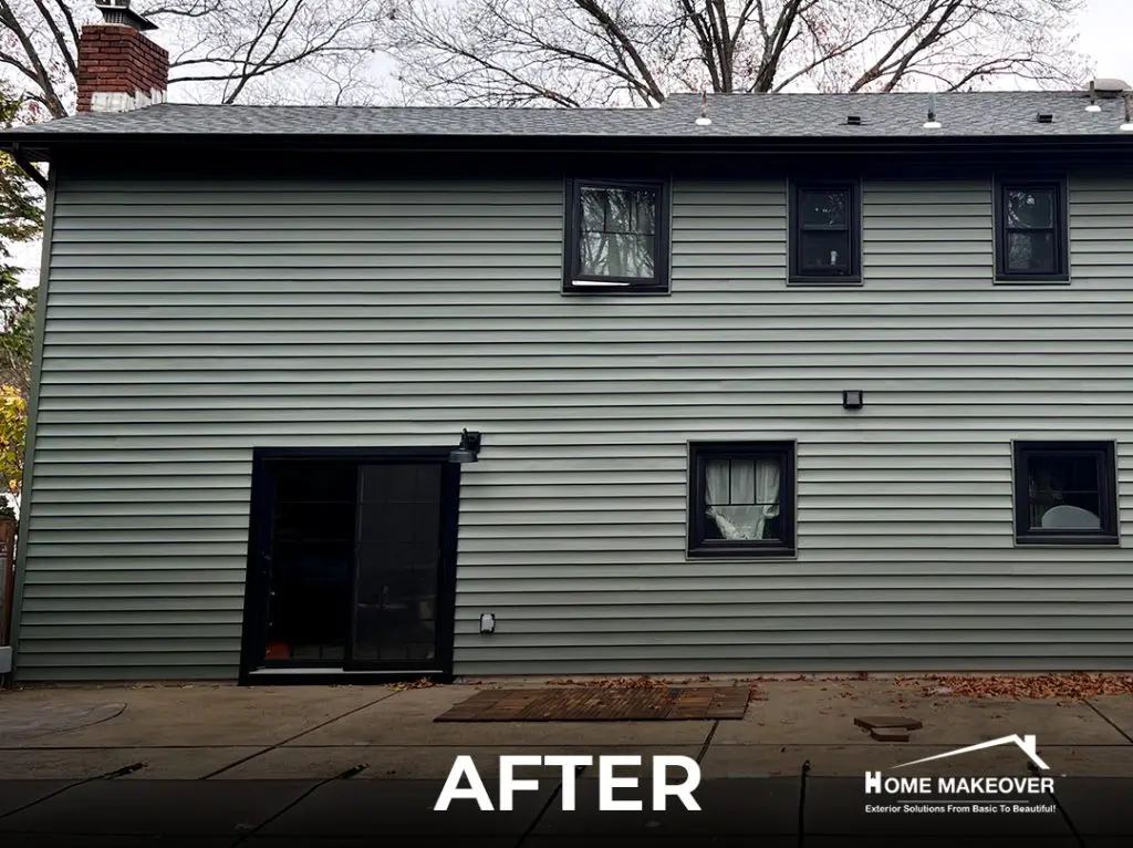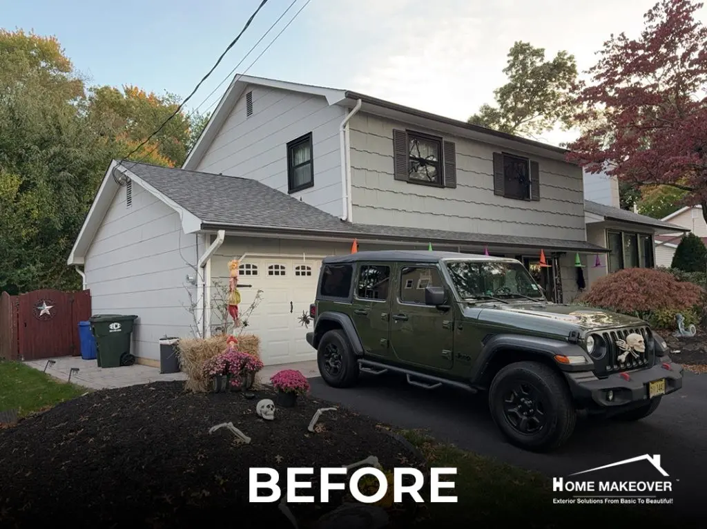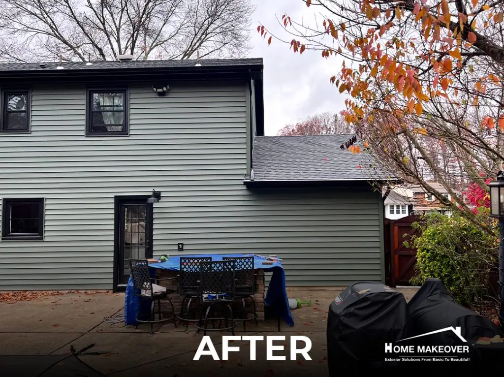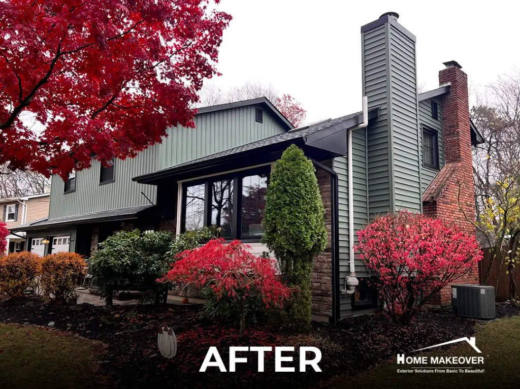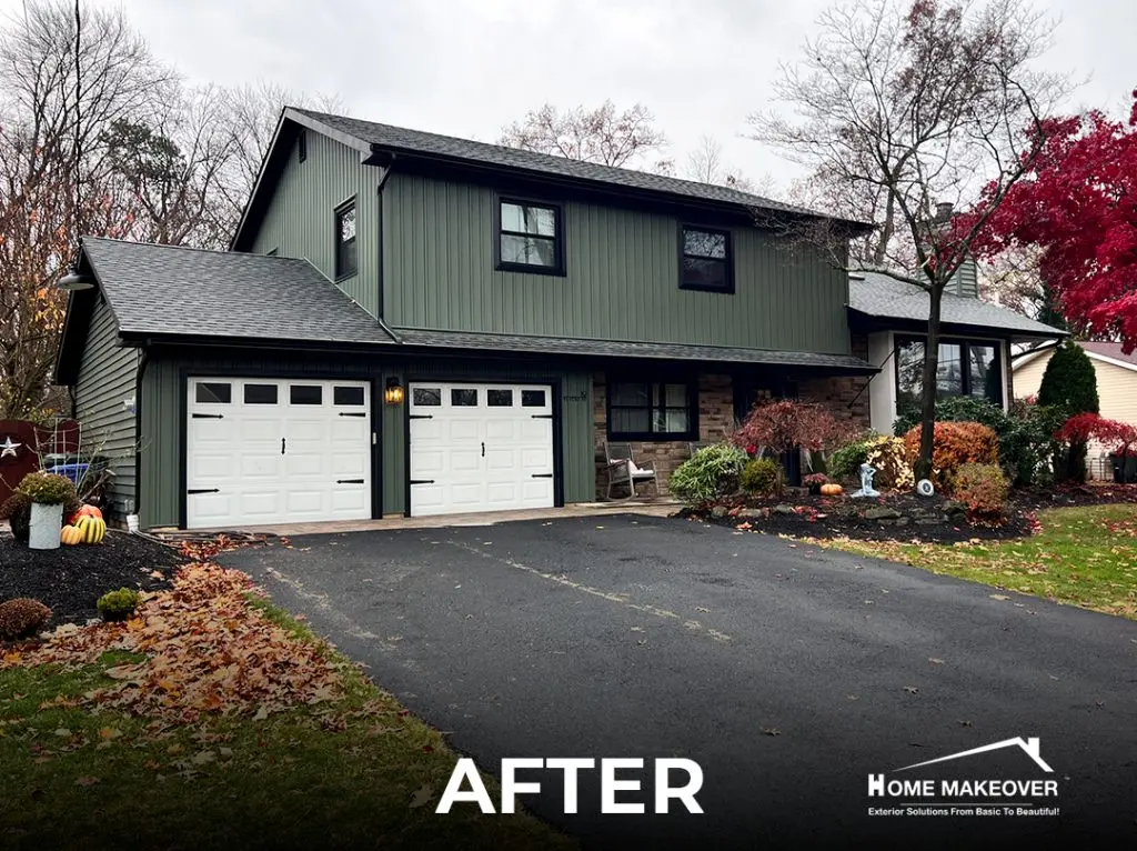 In Morganville, NJ, this homeowner had a clear vision: keep what works, update what doesn’t. As a local siding contractor in NJ, we helped bring that vision to life without starting from scratch. The house was fully wrapped in synthetic house wrap and rigid foam insulation to prep for a new Norandex® Performance siding system. On the second story and front elevation, we installed vertical 7″ Board & Batten siding in Myrtle Green for a bold look. The first story sides and rear were finished with 5″ Clapboard, creating contrast while keeping a consistent color throughout. The existing black trim around newer windows was kept, per the homeowner’s request, while we replaced door and basement window trim with matching black. A touch of stone siding was added to the front entry wall, with space set aside to reattach the flag bracket using longer masonry screws. Black soffit, garage trim, and weatherstripping helped tie all the new elements together. The white AZEK trim around the triple window stayed in place, keeping part of the home’s original character. This siding project was less about removing everything and more about working smart—with a focus on blending styles, saving materials, and finishing with a clean, unified look.