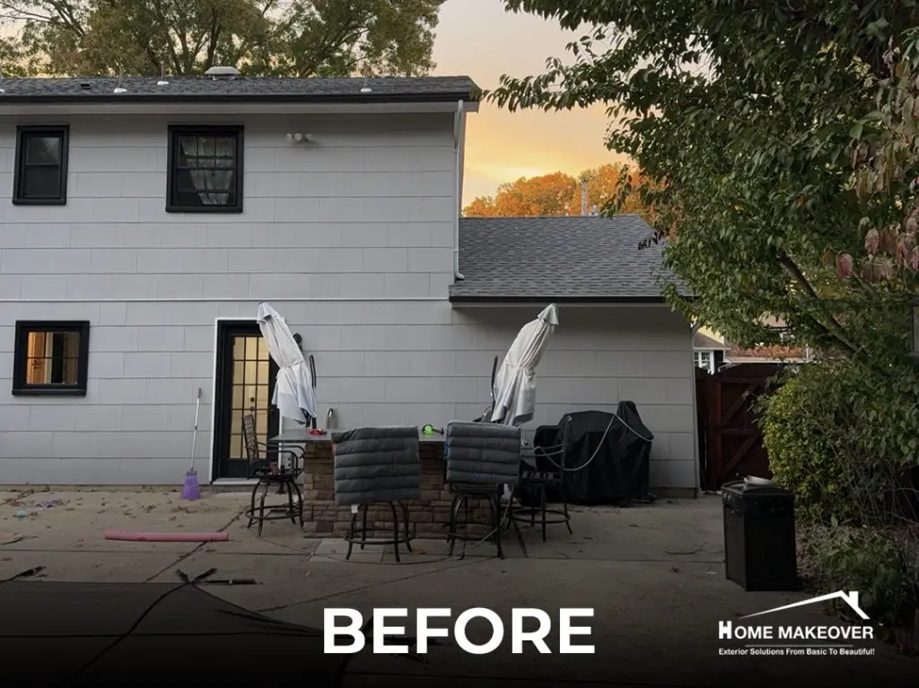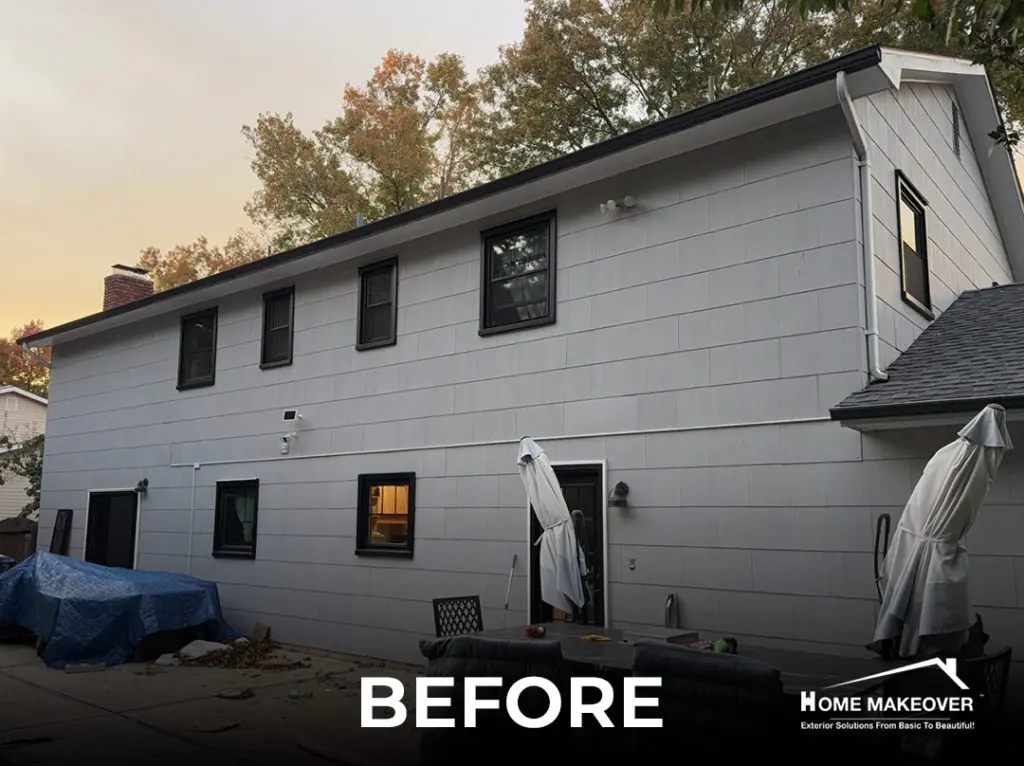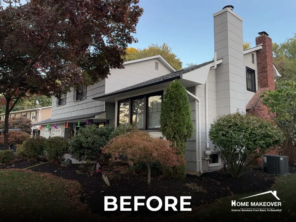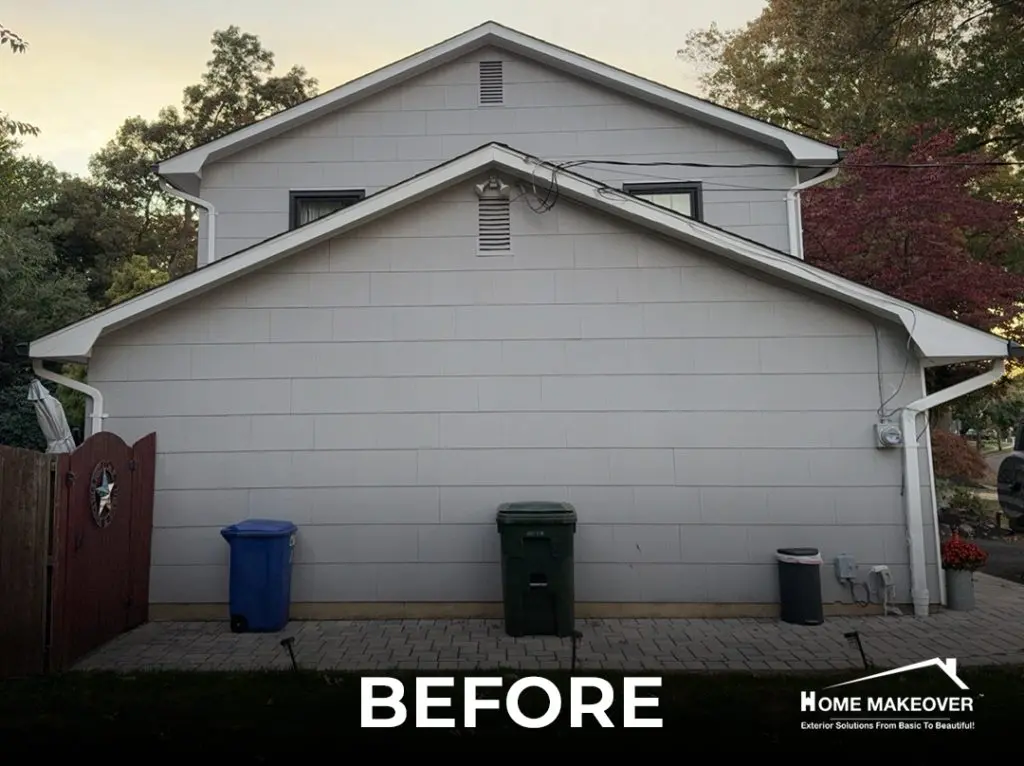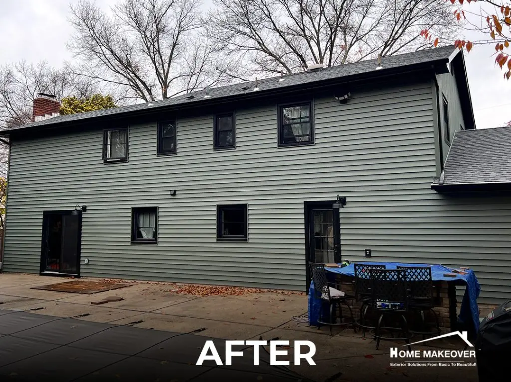 In Morganville, NJ, this homeowner had a clear vision: keep what works, update what doesn’t. As a local siding contractor in NJ, we helped bring that vision to life without starting from scratch. The house was fully wrapped in synthetic house wrap and rigid foam insulation to prep for a new Norandex® Performance siding system. On the second story and front elevation, we installed vertical 7″ Board & Batten siding in Myrtle Green for a bold look. The first story sides and rear were finished with 5″ Clapboard, creating contrast while keeping a consistent color throughout. The existing black trim around newer windows was kept, per the homeowner’s request, while we replaced door and basement window trim with matching black. A touch of stone siding was added to the front entry wall, with space set aside to reattach the flag bracket using longer masonry screws. Black soffit, garage trim, and weatherstripping helped tie all the new elements together. The white AZEK trim around the triple window stayed in place, keeping part of the home’s original character. This siding project was less about removing everything and more about working smart—with a focus on blending styles, saving materials, and finishing with a clean, unified look.