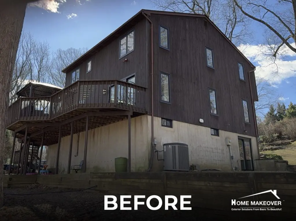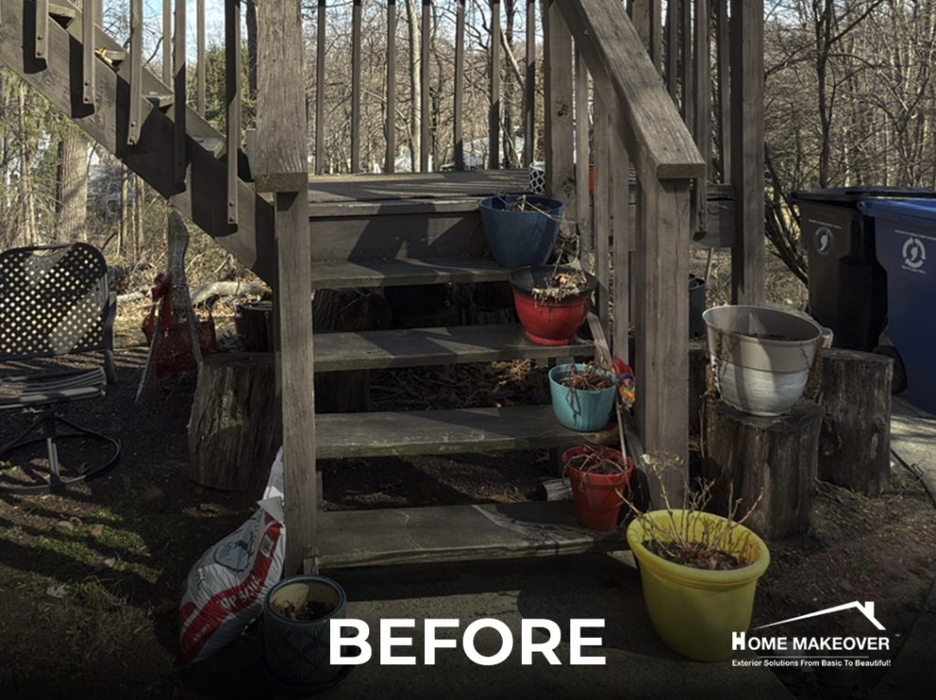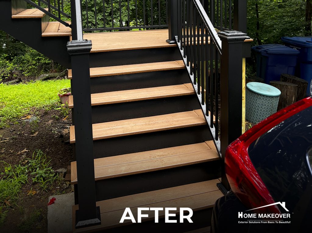 This deck replacement project in Leonardo, NJ brought both safety and style back to this beautiful outdoor space. The homeowners wanted a strong, low-maintenance deck that looked modern and matched their home’s exterior. The process started with removing all the old deck boards and railings to expose the wood substructure underneath. Once cleared, we added temporary shoring to support the existing main beam and frame during construction. The failing 4″x4″ wood posts were replaced with new 6″x6″ engineered exterior-grade lumber for better stability and long-term performance. These new posts were installed on galvanized steel raised base plates, keeping the wood elevated above ground moisture. For the surface, we used Fiberon® Good Life Decking from the Weekender Collection in Cabin Brown, a warm, natural tone that feels inviting and timeless. The fascia, stair risers, and stringers were wrapped in black PVC-coated aluminum, adding a sleek, finished look with strong protection.