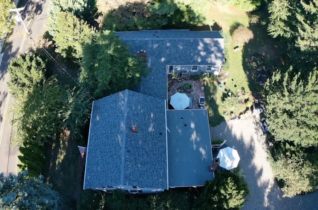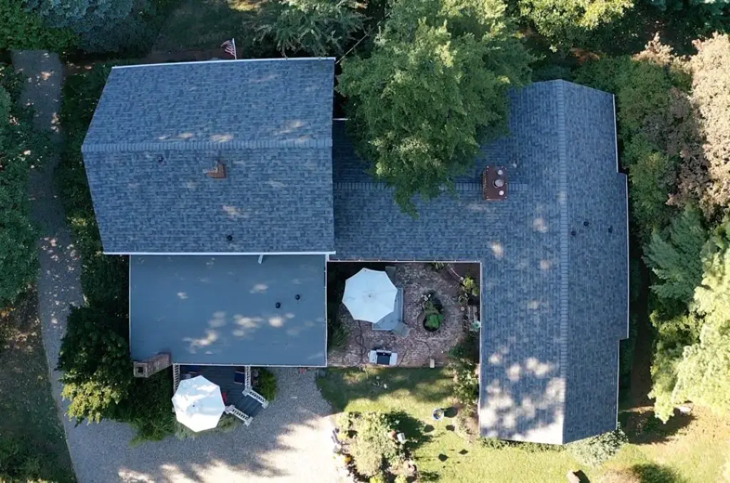 The homeowner chose Owens Corning TruDefinition Duration® Shingles with Algae Resistance in the popular Estate Gray color for the shingle portion of the roof. We also installed 5″ Aluminum K-Style gutters in white. For the siding repair, the homeowner chose Norandex Rustic Hill® 7″ Traditional Shake siding in the Granite color to match the rest of the house.