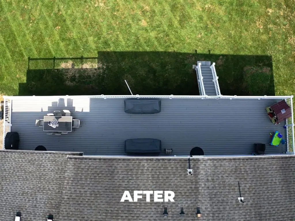 Additionally, the existing staircase was moved to the opposite edge of the deck area, with its size halved. The existing stair railings were repurposed for the new staircase, and the existing railing gate and hardware found a new home at the new stair location. A fresh railing and posts were also introduced to enclose the old gate location, enhancing safety and aesthetics. Furthermore, the perimeter of the deck and all steps received a picture-framed finish using square-edge deck boards, elevating the overall look. The DrySpace System was installed underneath the deck, specifically above the ground floor concrete patio area, diverting rainwater into a new gutter system installed along the inside of the main beam. Lastly, the project included the replacement of all existing railing post caps with new solar light caps.