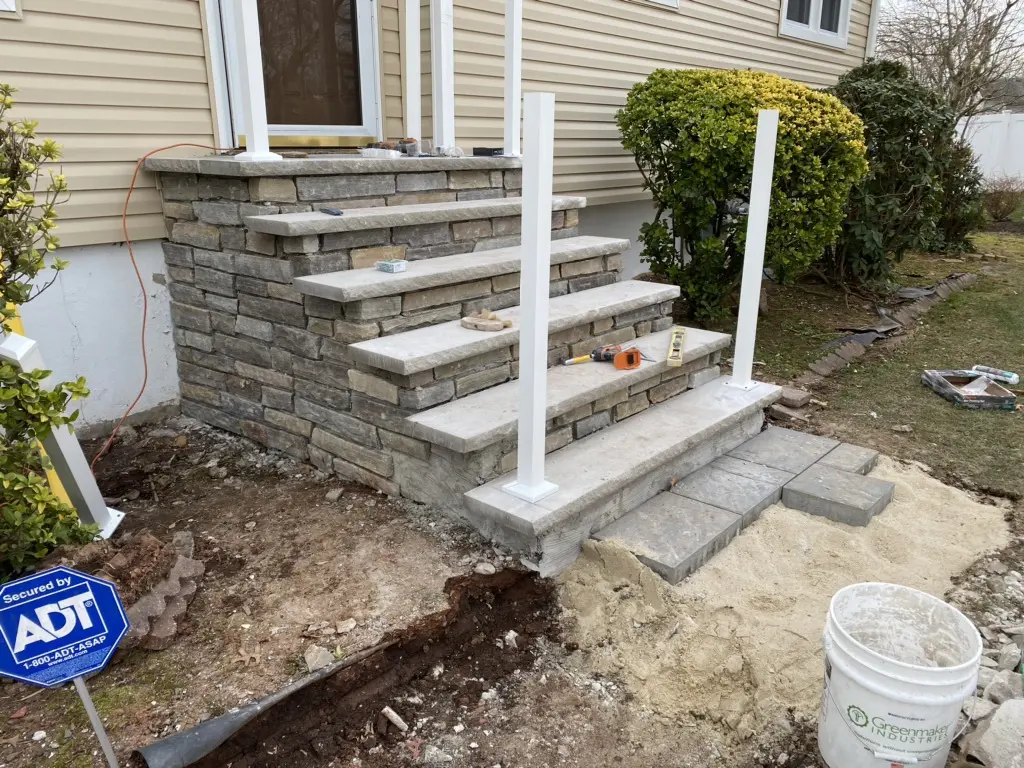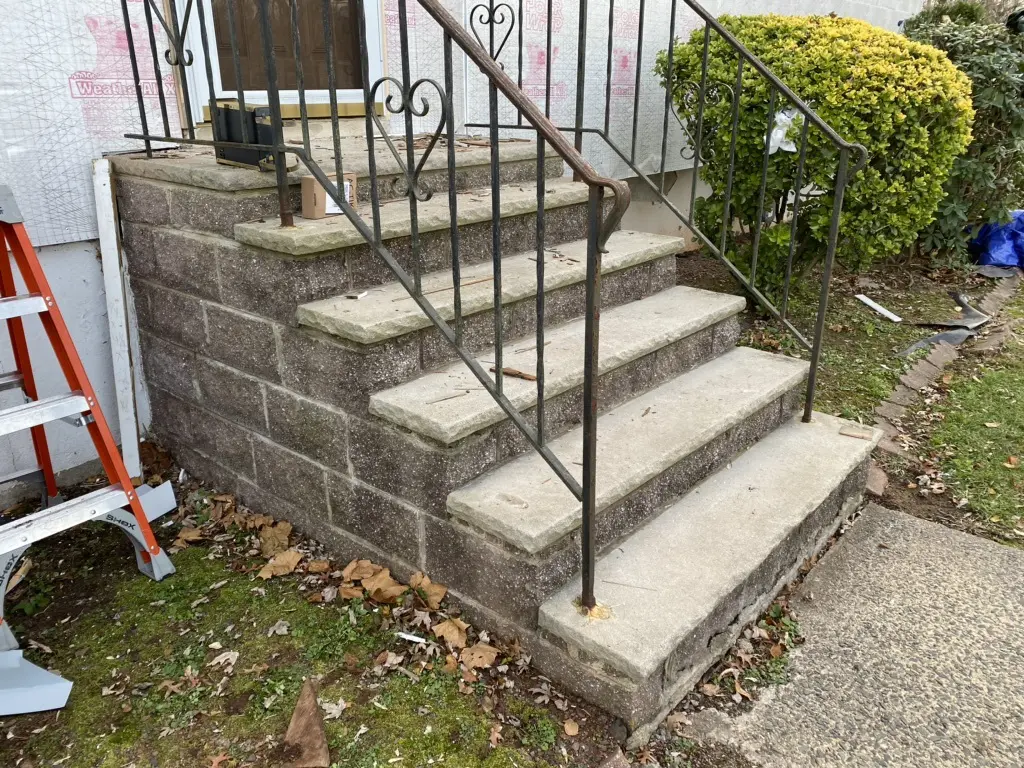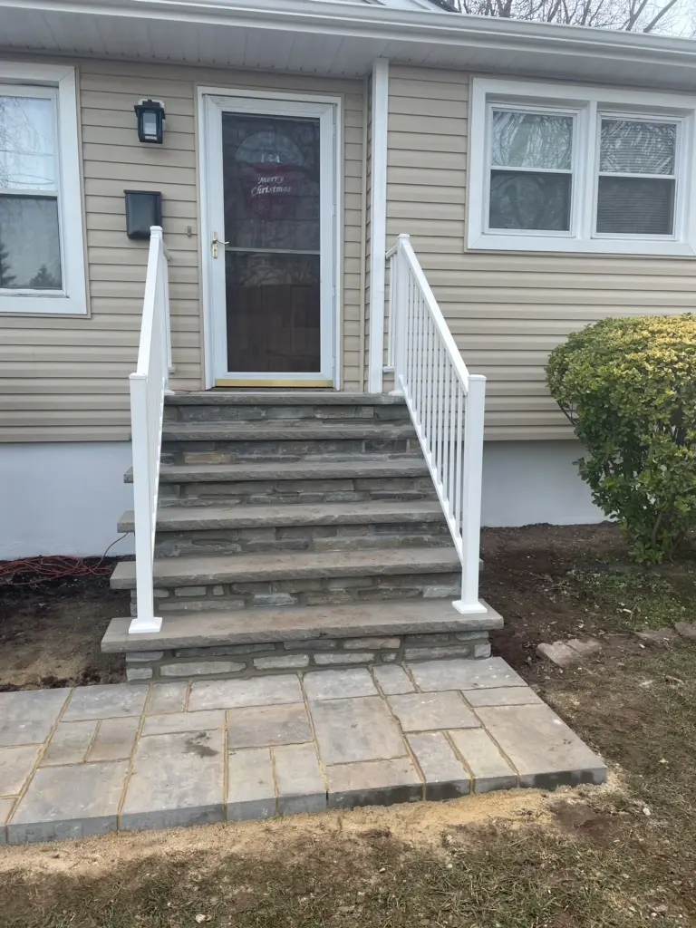 In addition to replacing their siding with brand new vinyl siding, the homeowner decided to upgrade their windows, doors, shutters, gutters & downspouts, and reface the stone on their front steps.