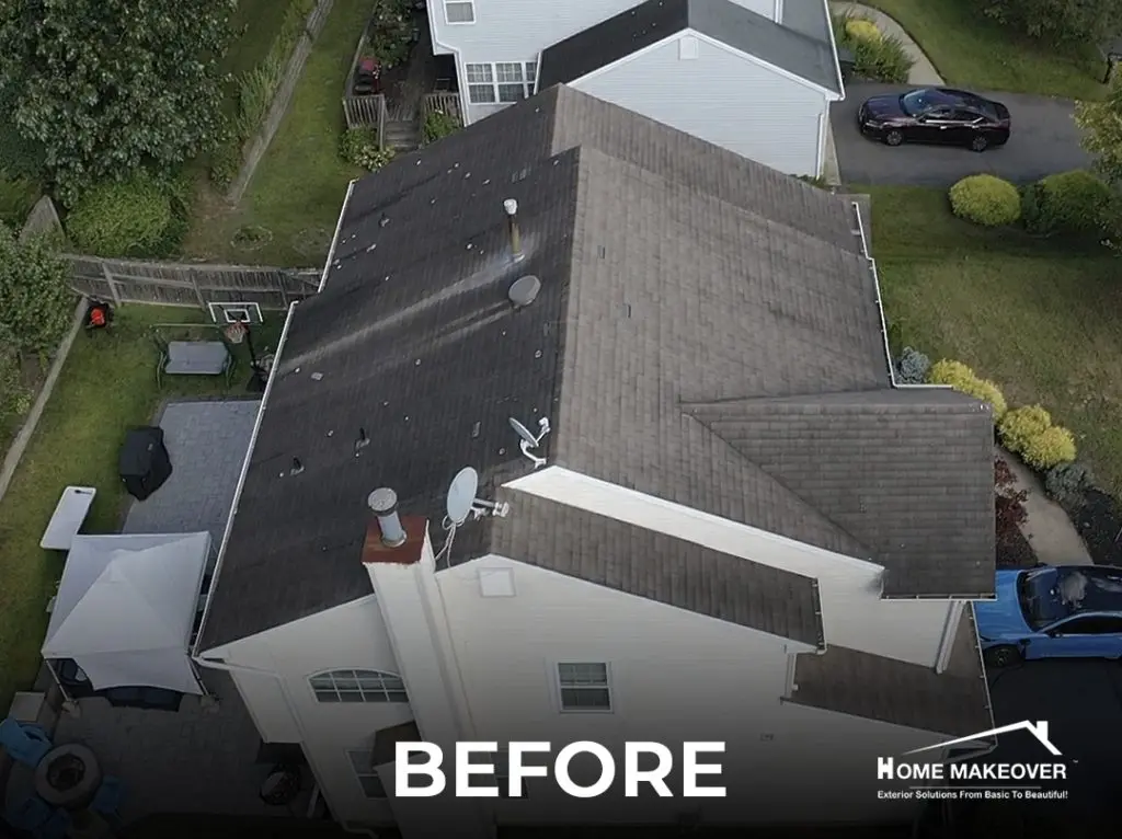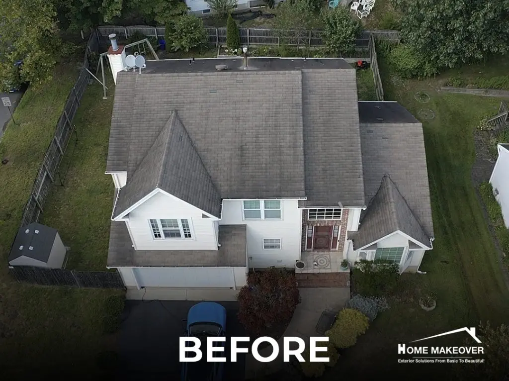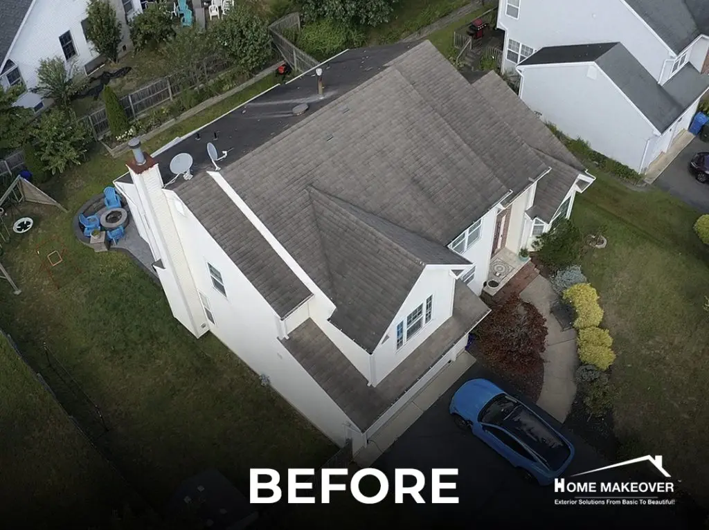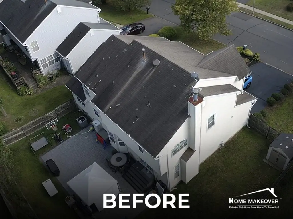 After years of exposure to New Jersey weather, this Old Bridge home was due for a serious upgrade. The project began with a full roof replacement, removing every layer of old material to expose the original wood sheathing underneath. With a clean base to work from, our team installed Owens Corning shingles in Onyx Black — a bold choice that gives the home a modern edge while adding lasting protection.