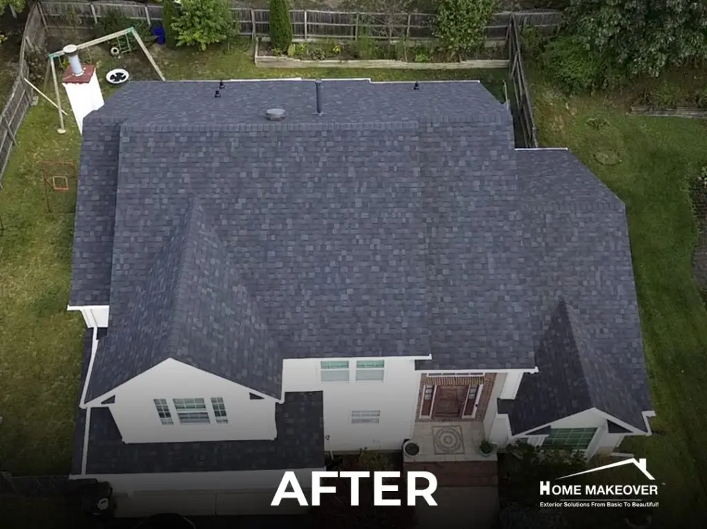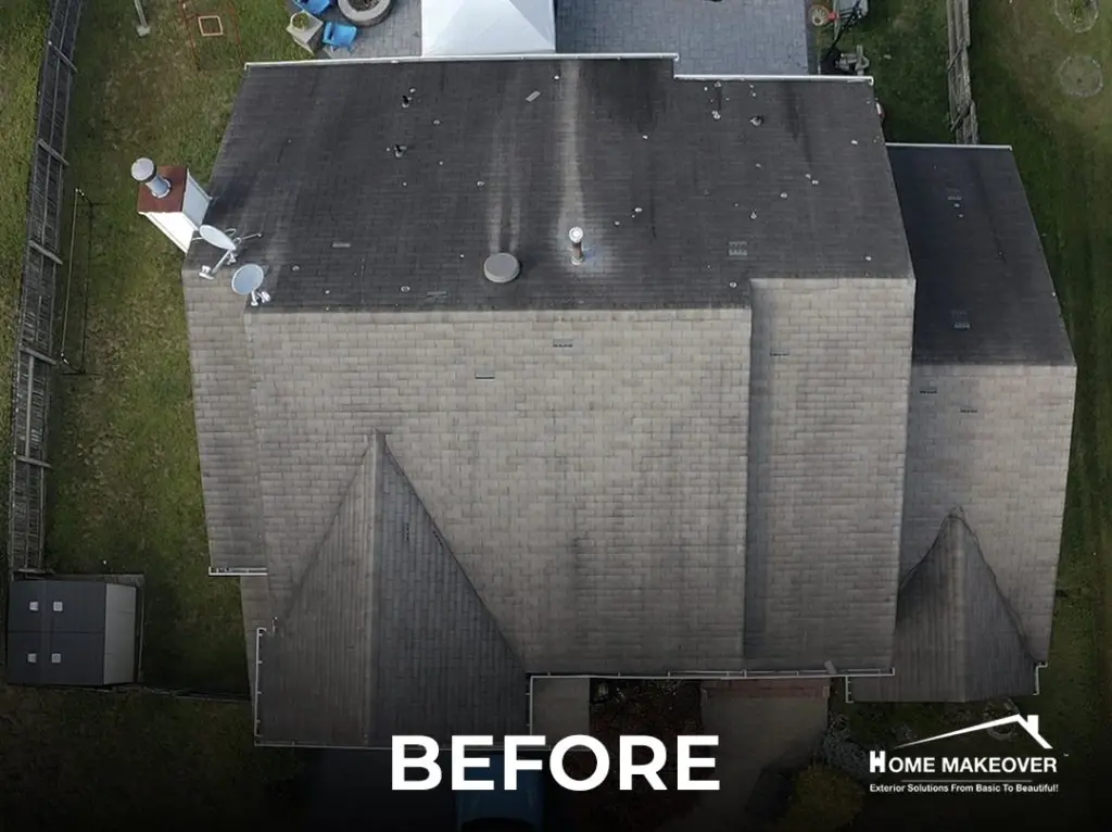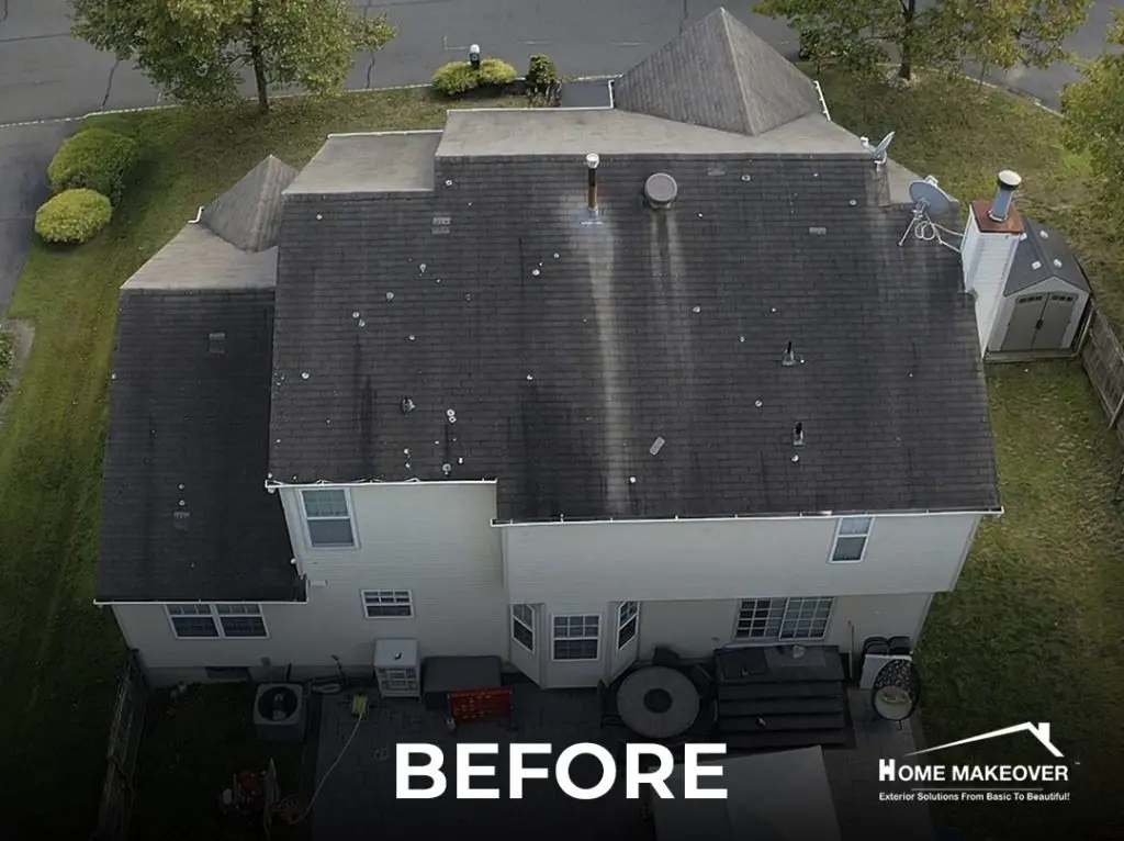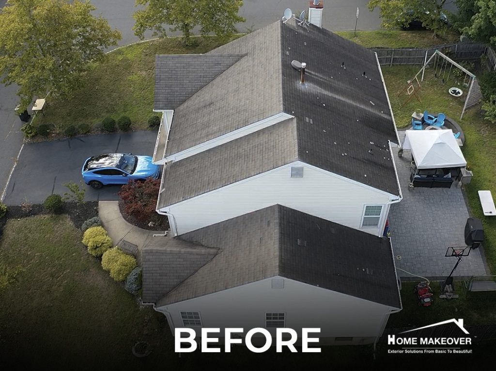 After years of exposure to New Jersey weather, this Old Bridge home was due for a serious upgrade. The project began with a full roof replacement, removing every layer of old material to expose the original wood sheathing underneath. With a clean base to work from, our team installed Owens Corning shingles in Onyx Black — a bold choice that gives the home a modern edge while adding lasting protection.