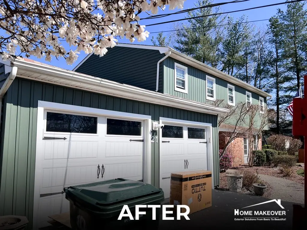 Not every siding project starts with a full tear-off. In this case, the homeowner wanted to refresh the front of the house while keeping the existing asbestos siding on the sides and rear in place. Located in Marlboro, NJ, the project focused on giving the home a cleaner, more updated look without doing more than necessary. For this siding replacement, we removed the front-facing wood siding to expose the sheathing and started from there. The new look features vertical 7″ Board & Batten siding in Myrtle across the front, contrasted with 5″ horizontal Dutch Lap on the sides and rear—both using Norandex® Performance siding. Inside and outside corners were matched to the Myrtle color to keep the design unified. Before installing the siding, we wrapped the full home with synthetic underlayment and rigid foam insulation to boost protection behind the walls. We also modified the garage door framing, removing the original angled corners to create clean, straight lines for a sharper look. This project shows how small changes and good planning can make a big difference—especially when done by a local siding contractor in NJ who understands how to blend new and existing features.