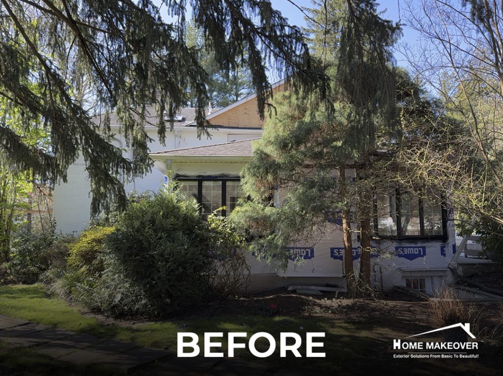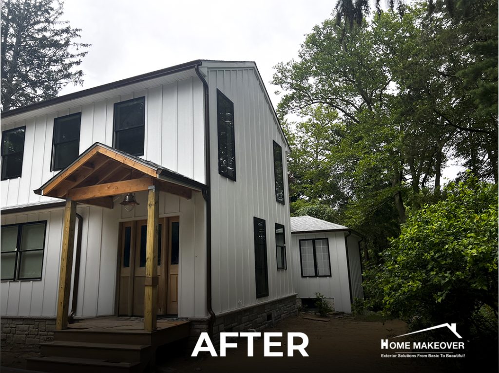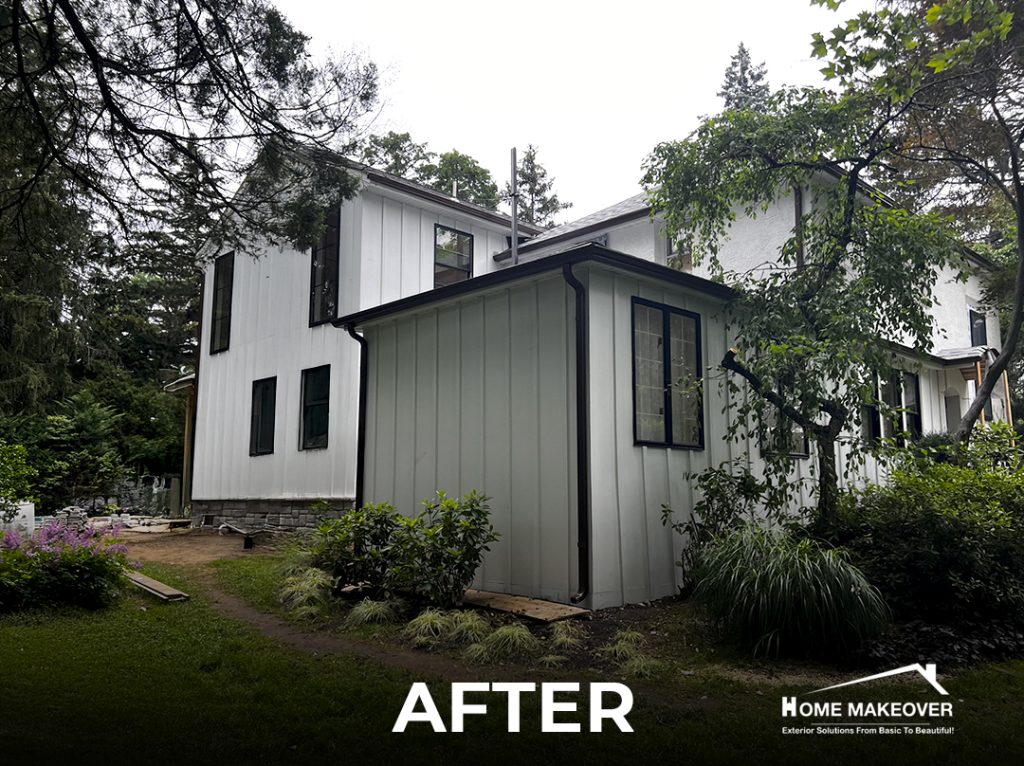 This siding replacement project in Red Bank, NJ brought a clean, modern update to the home’s exterior. The first step was removing the small “eyebrow” overhang above the right side of the first-story roof to create a smooth, flush wall surface. This change allowed for a seamless installation of the new siding system, improving both the look and structure of the home. Our team installed James Hardie Board & Batten siding, known for its durability and designer finish. The vertical lines of this style gave the home a taller, more contemporary appearance.
