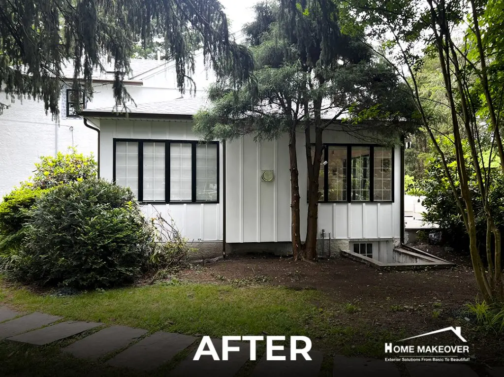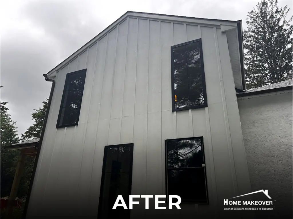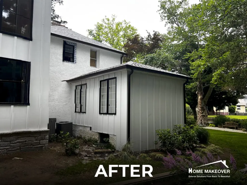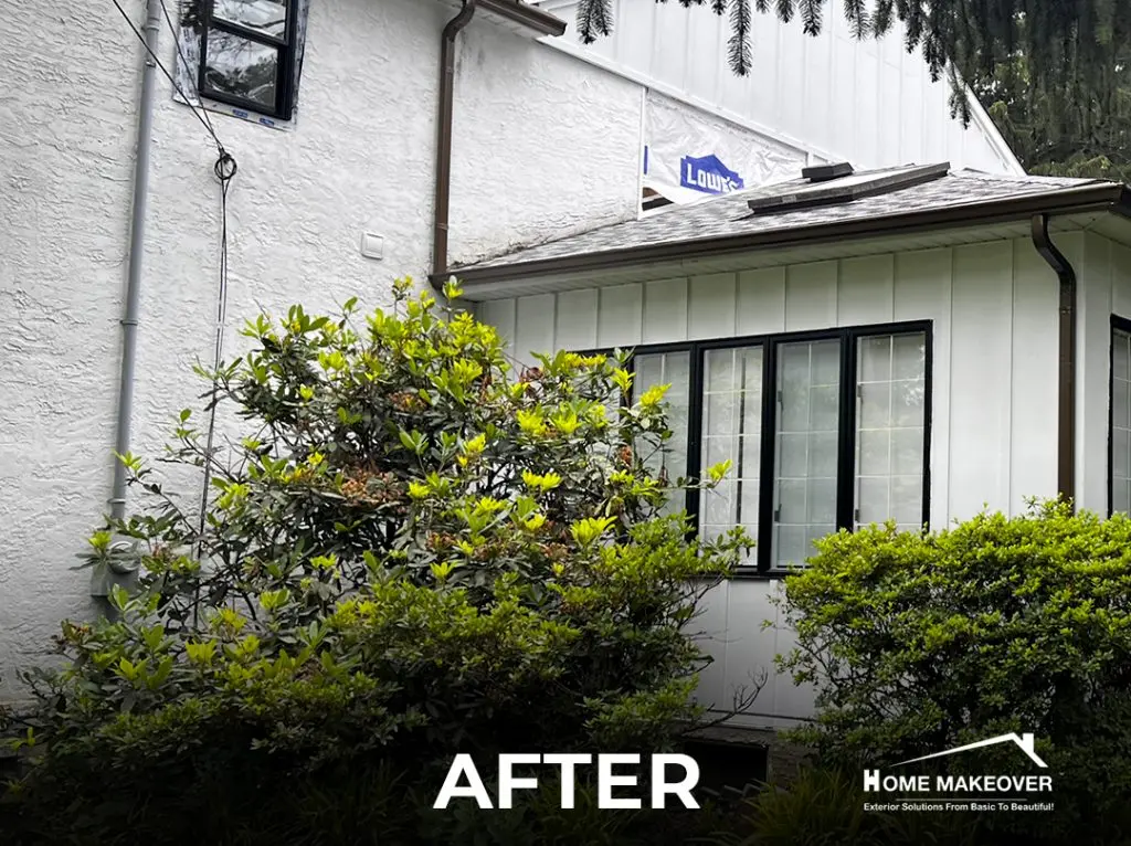 This siding replacement project in Red Bank, NJ brought a clean, modern update to the home’s exterior. The first step was removing the small “eyebrow” overhang above the right side of the first-story roof to create a smooth, flush wall surface. This change allowed for a seamless installation of the new siding system, improving both the look and structure of the home. Our team installed James Hardie Board & Batten siding, known for its durability and designer finish. The vertical lines of this style gave the home a taller, more contemporary appearance.