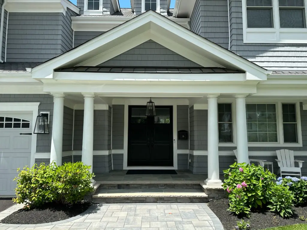 The homeowners chose the Rustic Hill S7″ Traditional Shake siding in the Granite Grey color. They also chose white solid AZEK pvc trim and soffits to accent all around the entire house. Lastly, new K-Style gutters were installed to control the roof line water and look great with the rest of the makeover. The beauty of this home will now last a lifetime.