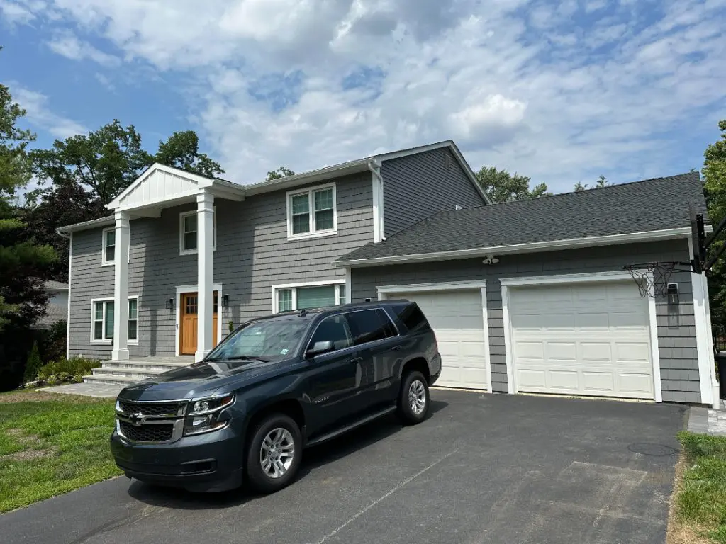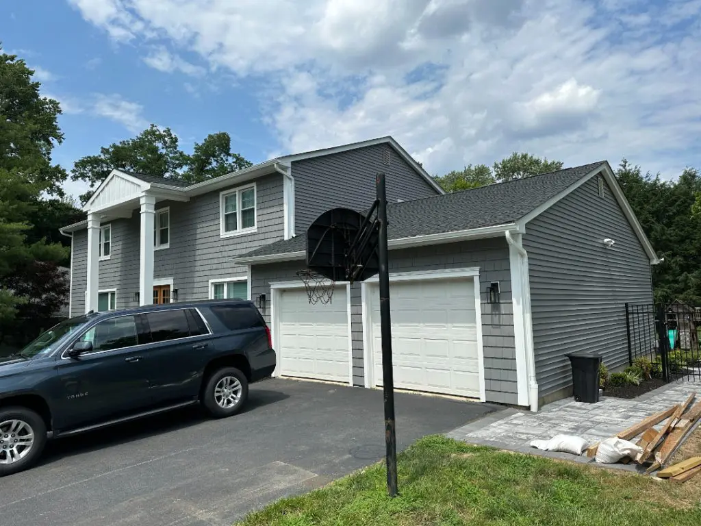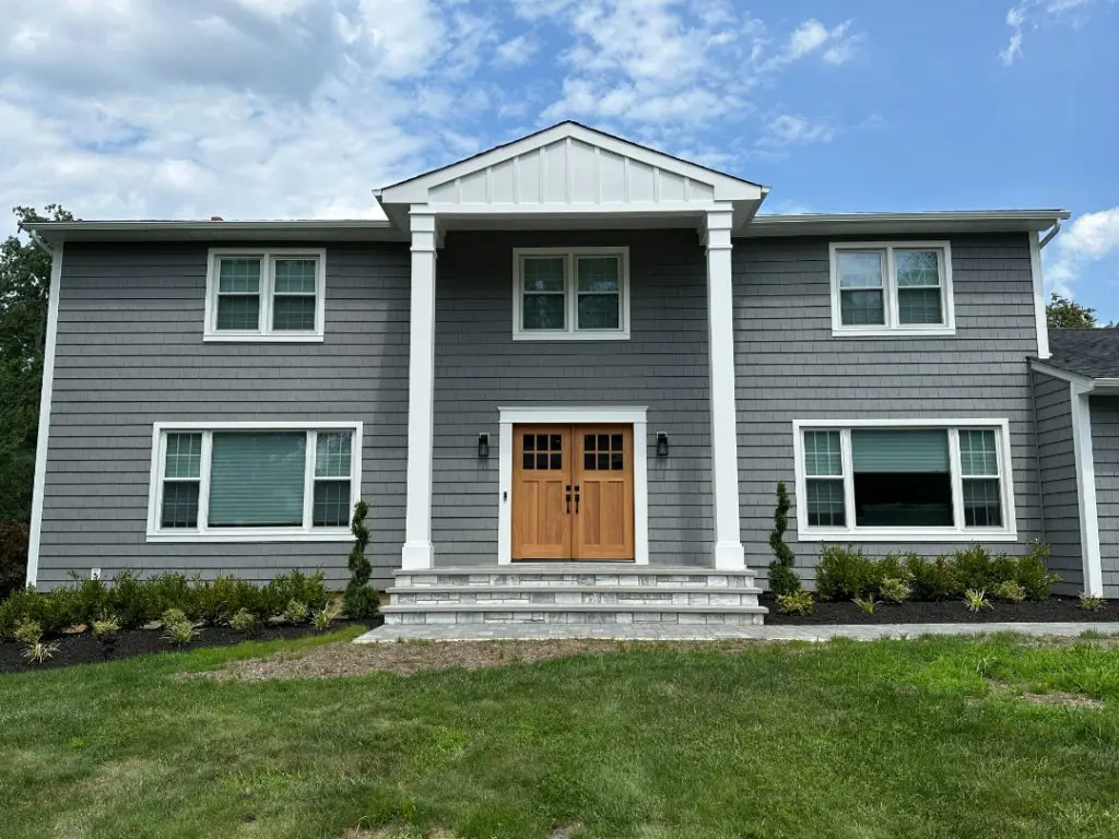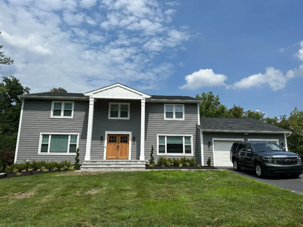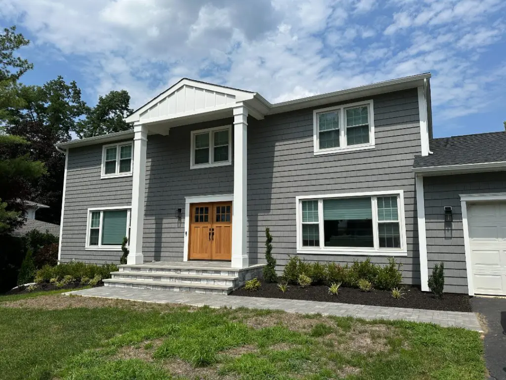 Upon the project’s completion, the homeowner was delighted with the outcome. The new horizontal vinyl siding on both sides and the rear of the house blended harmoniously with the 7″ cedar impression shake style siding across the front in Charcoal Gray, creating a stunning exterior that exuded modern elegance. The attention to detail and use of premium materials, such as Azek trim, added a touch of luxury and distinction to the home’s facade.